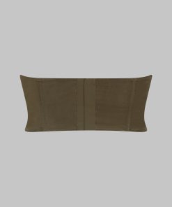 Bustier shape with flexible vertical boning in the front and back. Fastens at the back with a adjustable clip.