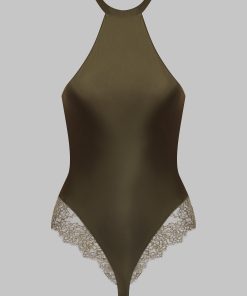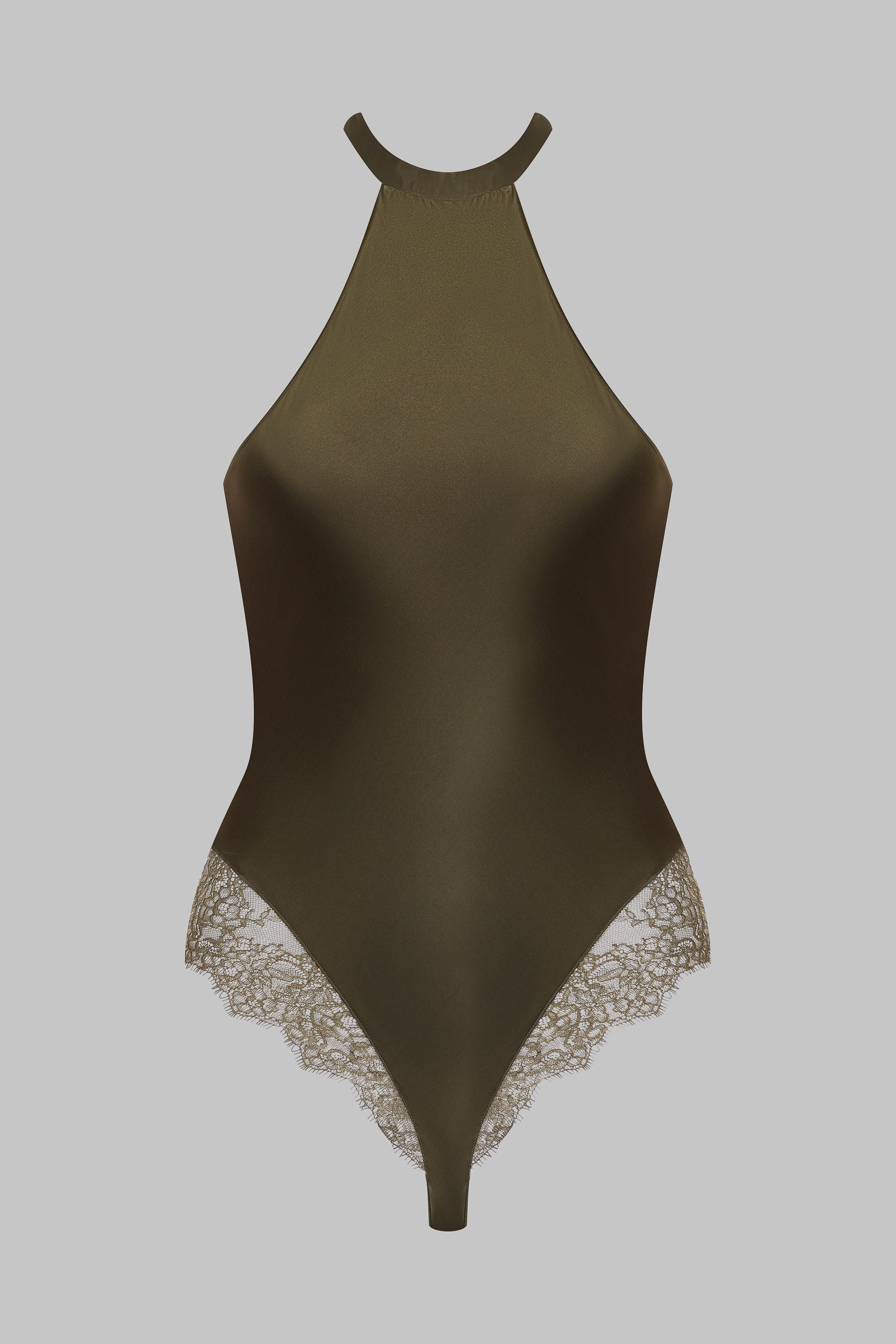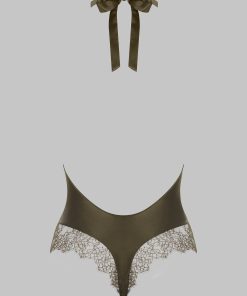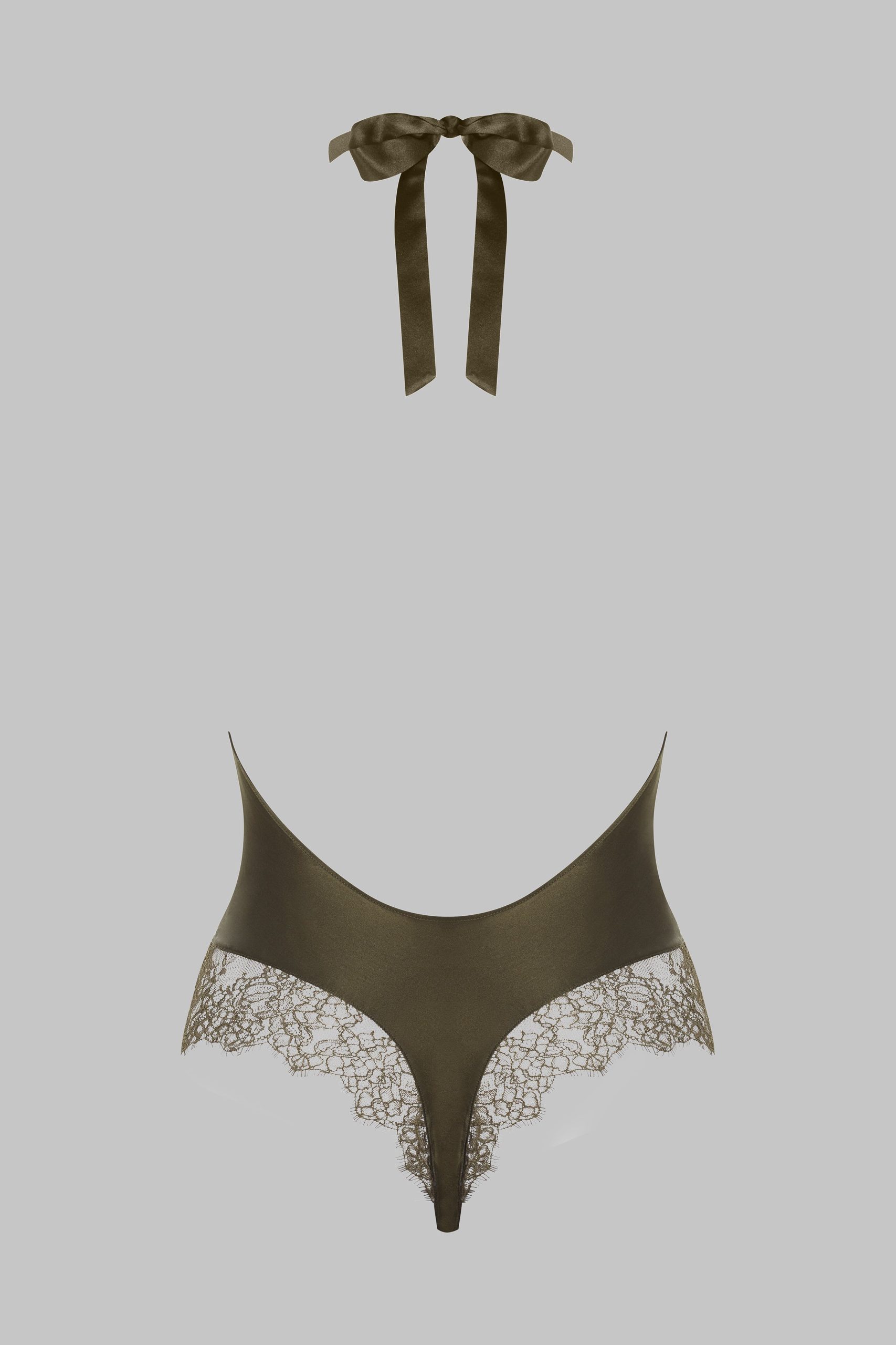 Thong body with American neckline in silk and eyelash lace. Scoop cut adorned with rigid lace that subtly shows-off the hips and buttocks. An American neckline delicately reveals the bust. Neck closure with silk ribbon to tie as you desire. Non-openable crotch for extra comfort.