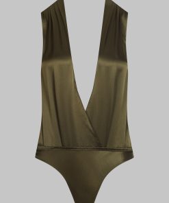 Wrap over thong bodysuit in natural silk with a deep V neckline. Sublime pleats at the shoulders and a perfect thong cut make it an essential garment. A thin elastic waistband covered in gathered silk elegantly outlines the waist. Non-openable crotch for extra comfort.