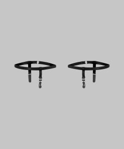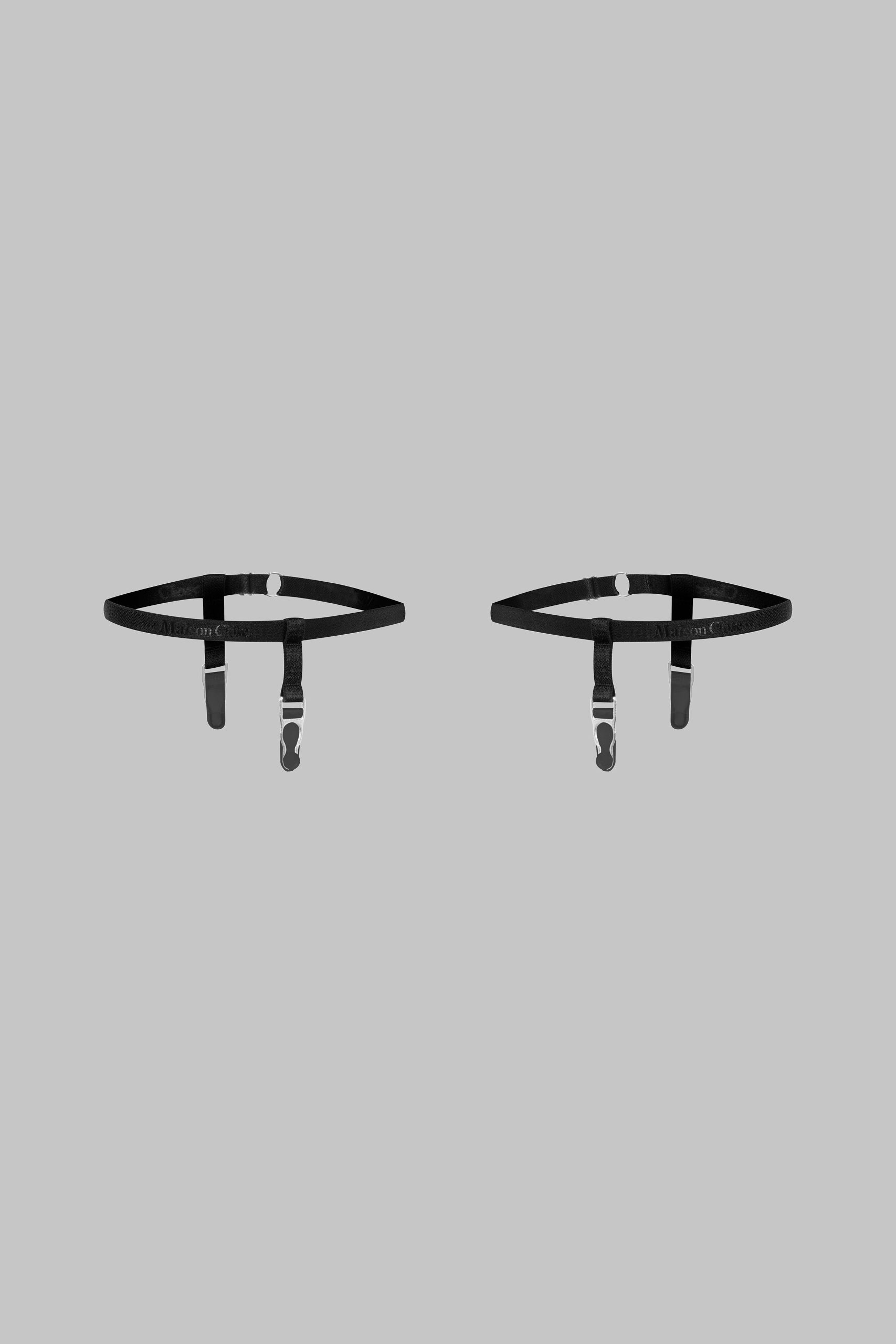 Two Signature garters stamped with the Maison Close logo. Adjustable elasticated bands with silver accents. Movable mini suspender straps for positioning on either side of the leg once the garter is adjusted.